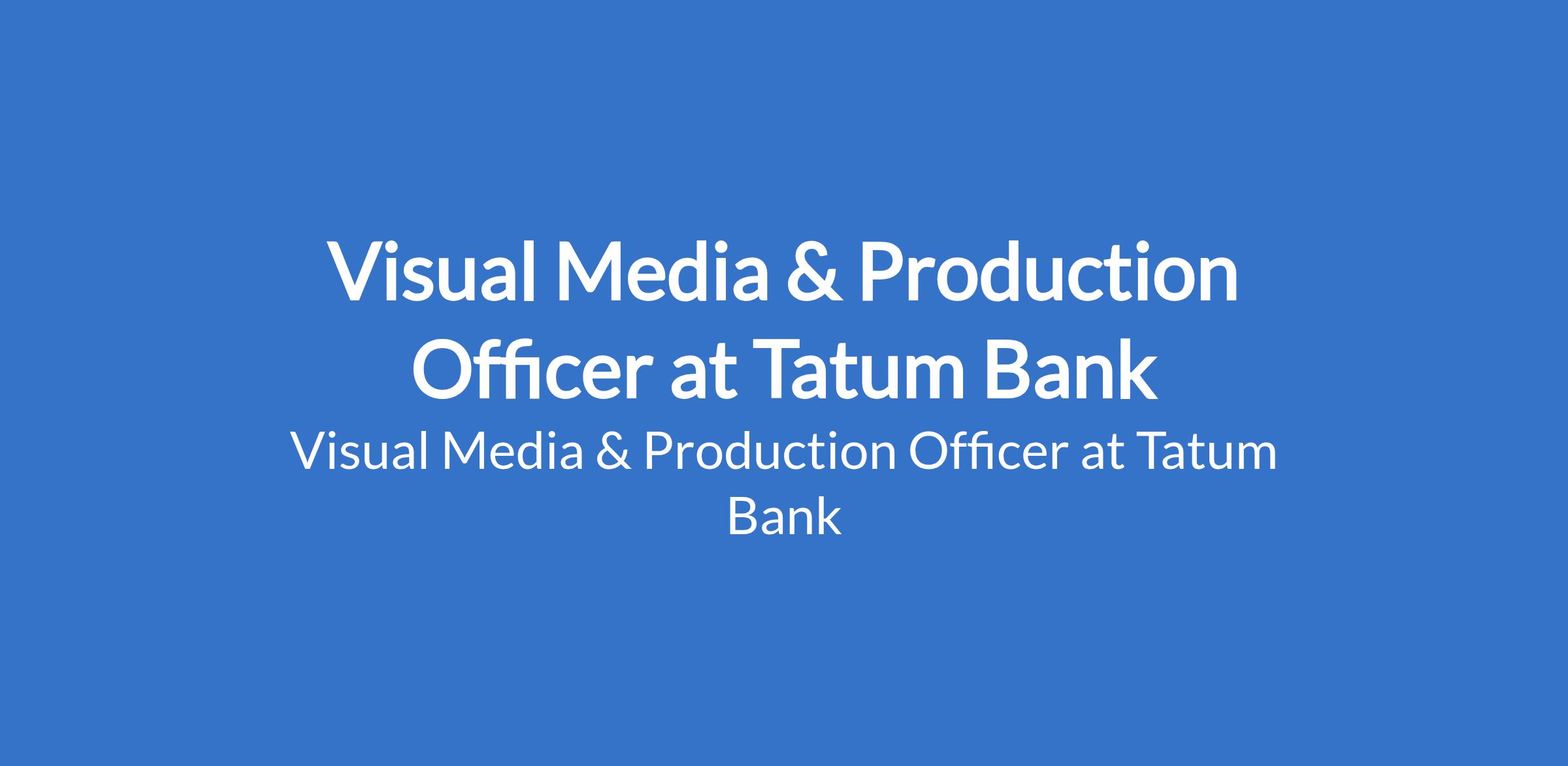 Tatum Bank is recruiting to fill the position of: Visual Media & Production Officer. The position is located in Lagos State. Interested candidates should possess a Bachelors Degree in Mass Communication, Fine Arts, Visual Design, Multimedia, Film & Media Studies, or related discipline with 2 - 4 years work experience.