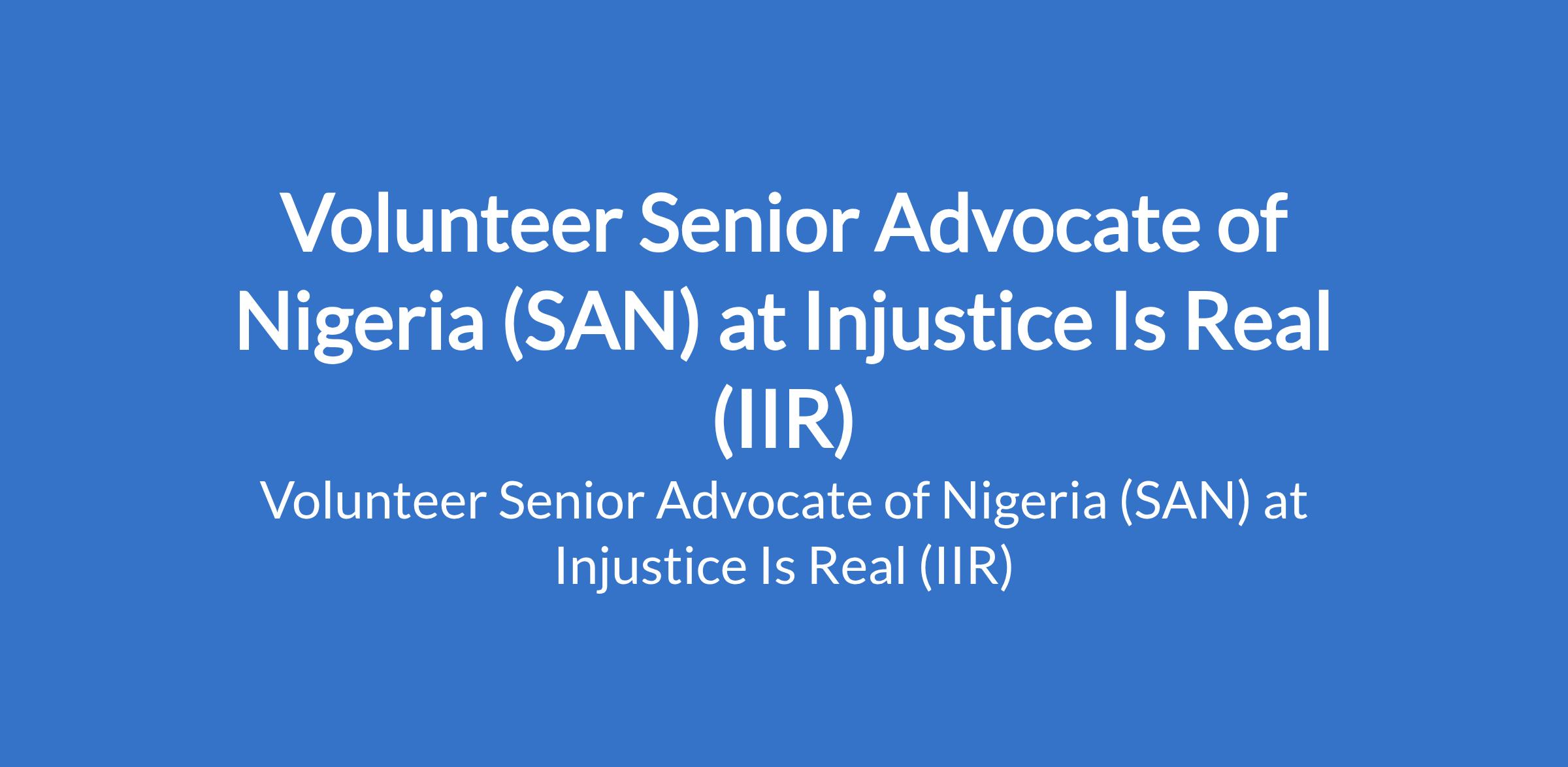 Injustice Is Real (IIR) is recruiting to fill the position of: Volunteer Senior Advocate of Nigeria (SAN). The position is located in Lagos State. Interested candidates should be a qualified Senior Advocate in Nigeria, and must possess an LLB or BL qualification; an LLM qualification is desirable but not essential, with at least 7-10 years post-call experience.