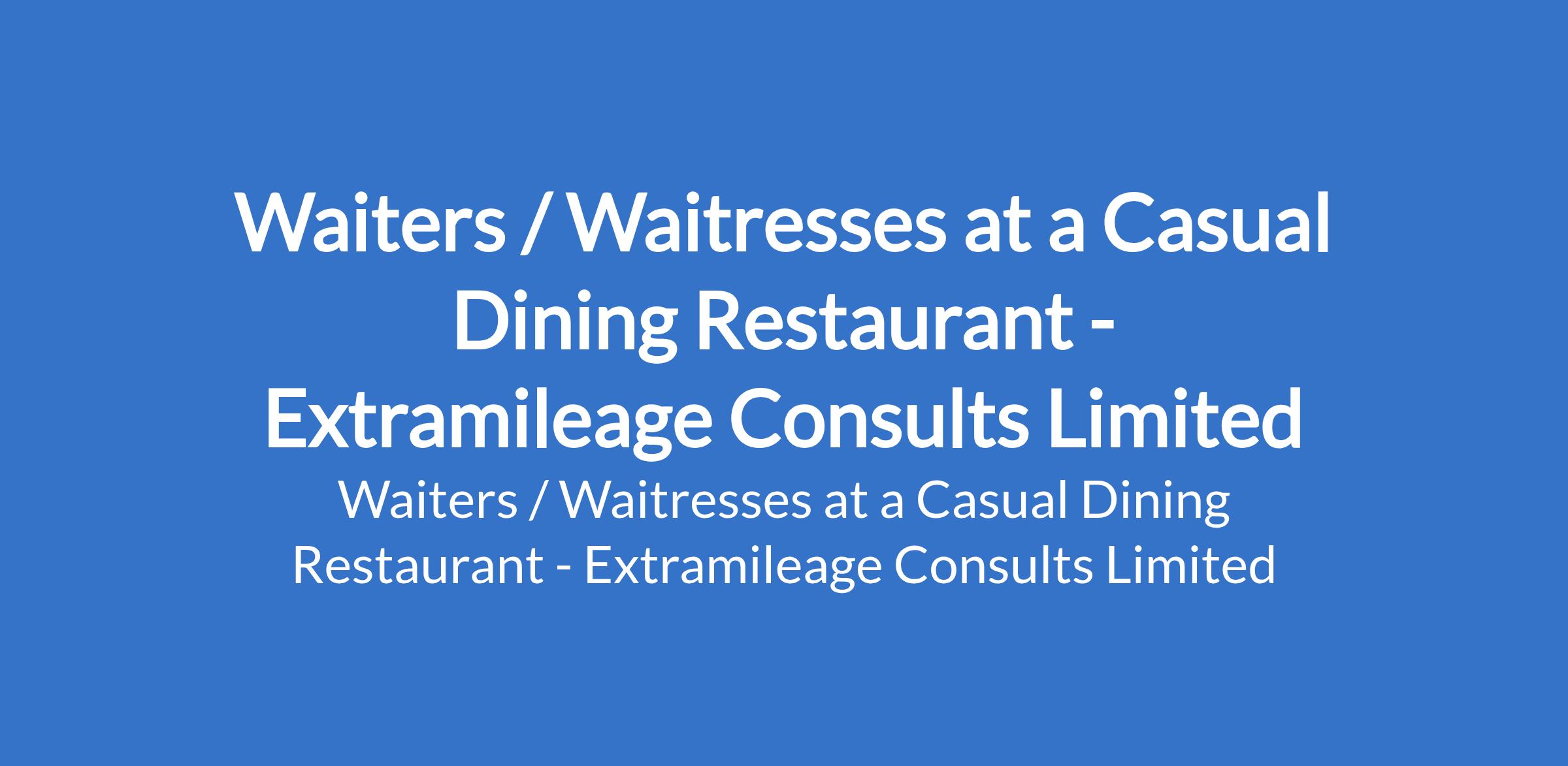 Extramileage Consults Limited - Our client, a Casual Dining Restaurant is recruiting to fill the position of: Waiter / Waitress. The position is located in Ikeja, Lagos State. Salary: N90,000 monthly. Interested candidates should possess relevant qualifications with a minimum of 2 years related experience.