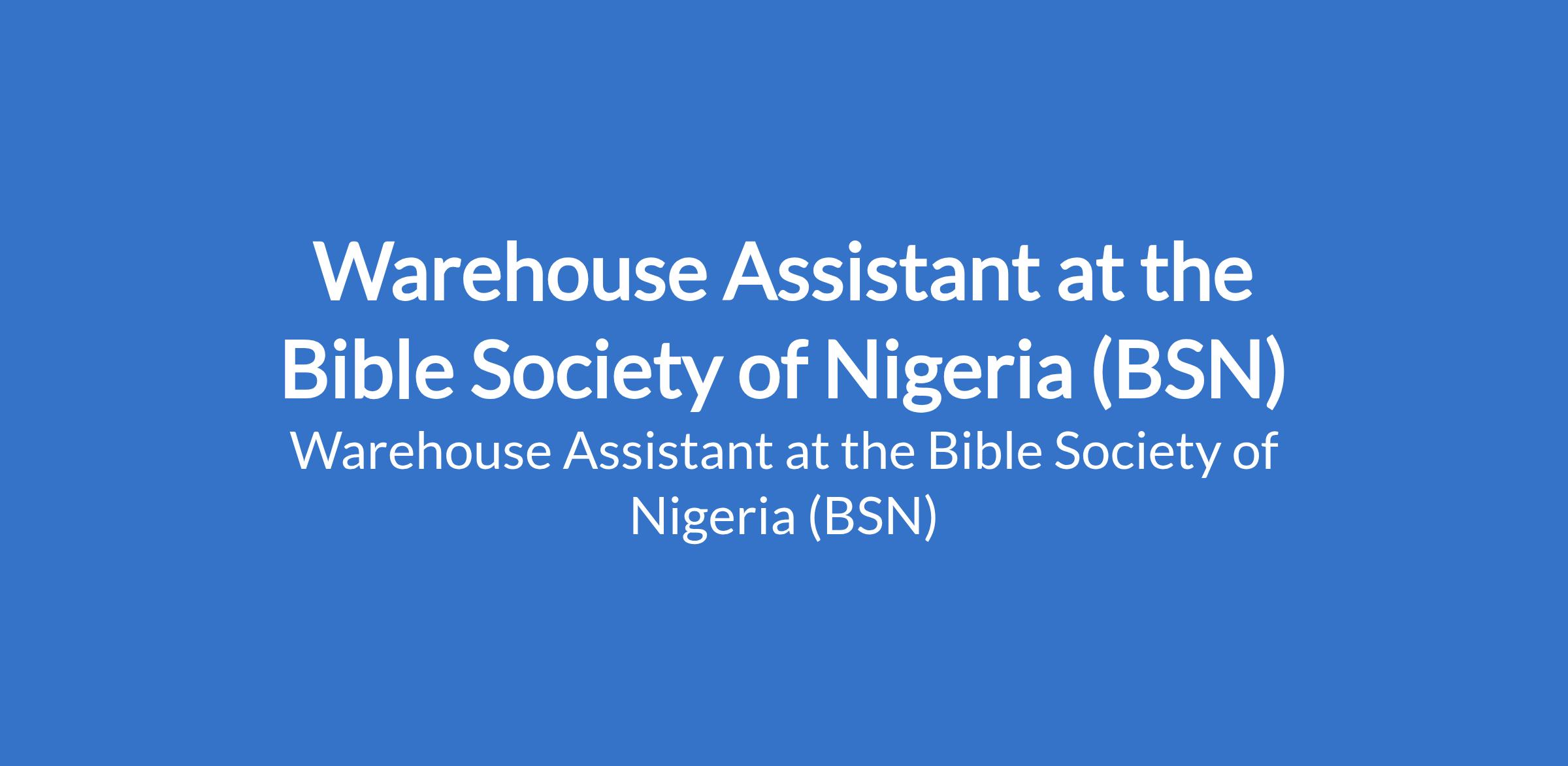 The Bible Society of Nigeria (BSN) is recruiting to fill the position of: Warehouse Assistant. The position is located in Lagos State. Interested candidates should possess a National Diploma (OND) in Accounting or Business Administration (or related discipline).
