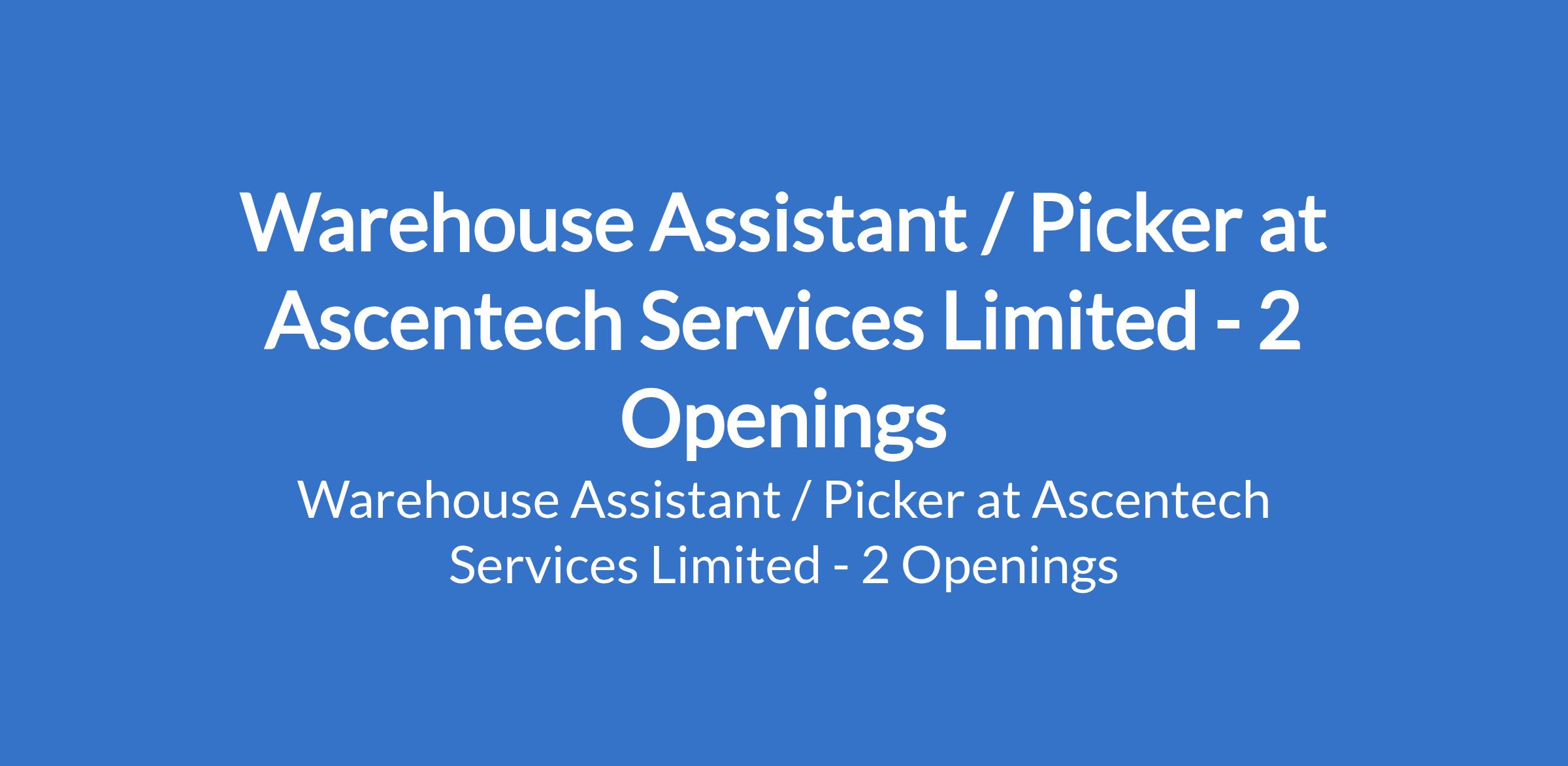 Ascentech Services Limited is recruiting to fill the position of: Warehouse Assistant / Picker. The position is located in Lekki, Ajah and its environs, Lagos State. Salary: N100,000 / month. Interested candidates should possess relevant qualifications with a minimum of 2 years warehouse or picking experience.