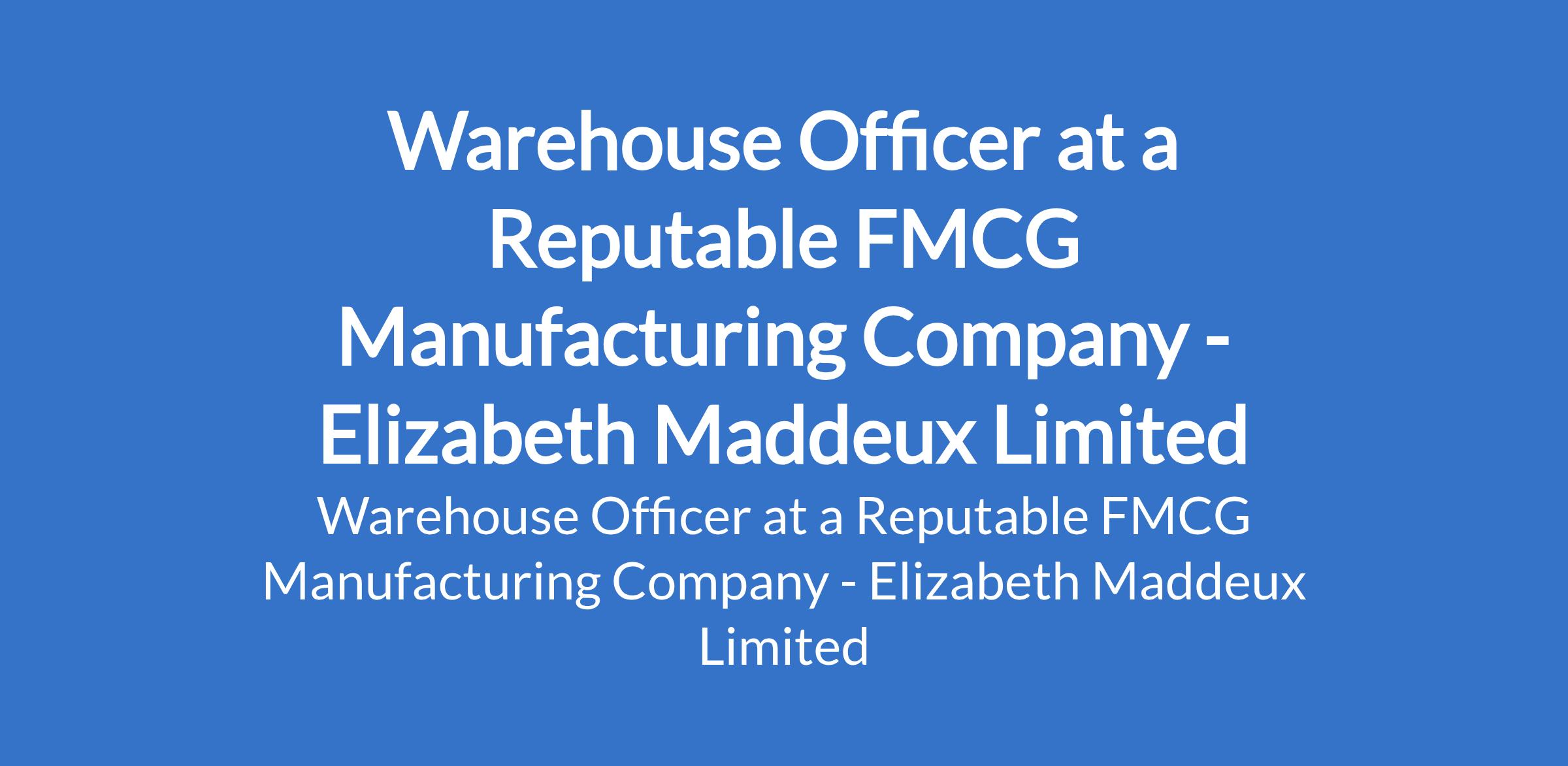 Elizabeth Maddeux Limited - Our client, a reputable FMCG Manufacturing company is recruiting to fill the position of: Warehouse Officer. The position is located in Abuja (FCT). Salary: N150,000 - N200,000 monthly. Interested candidates should possess a Bachelors Degree or HND in Supply Chain, Logistics, Business Administration, or a related field with a minimum of 3 years experience in warehouse operations, preferably in an FMCG environment.