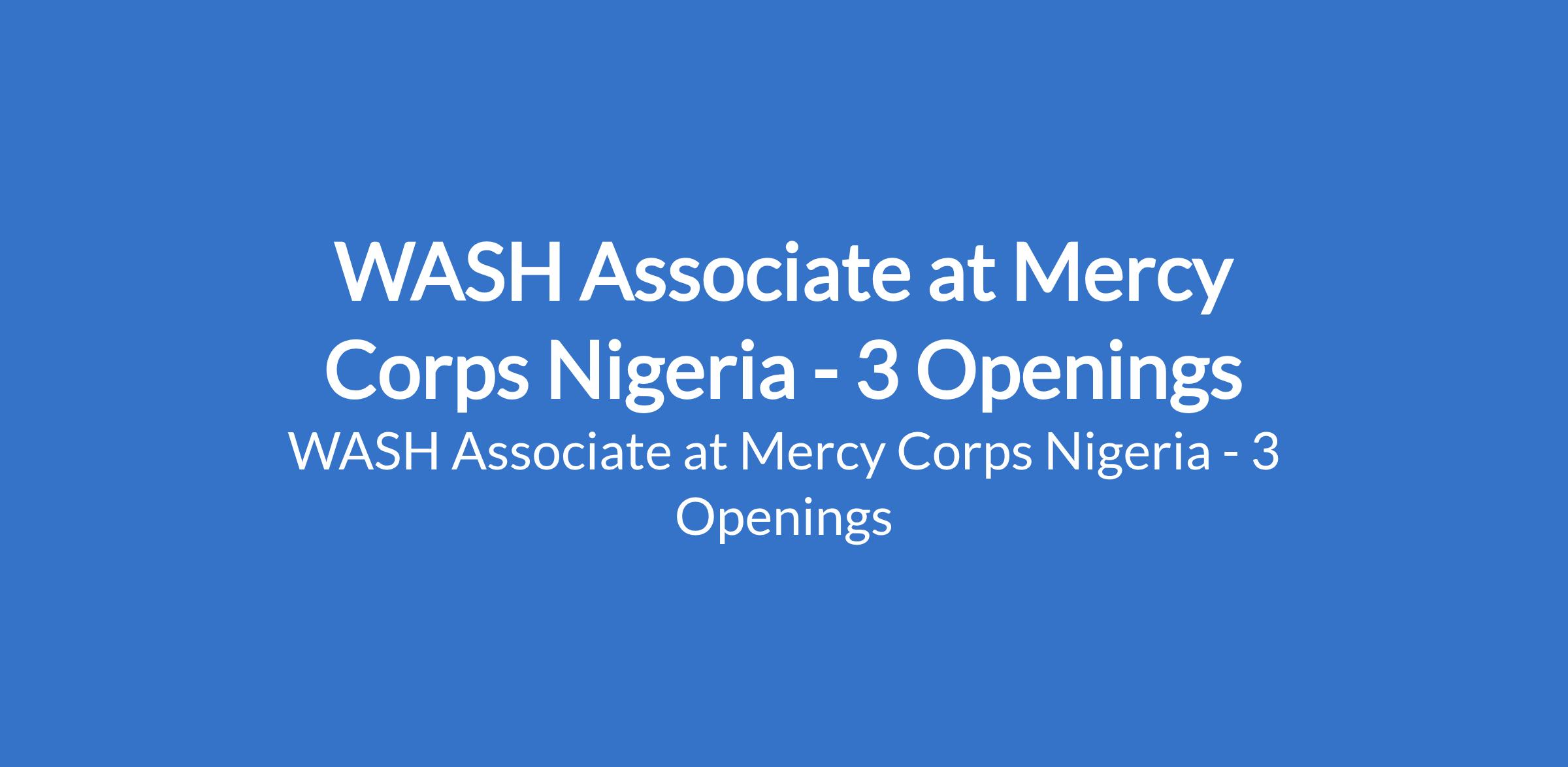 Mercy Corps Nigeria is recruiting to fill the position of: WASH Associate. The position is located in Konduga,Jere,Ngala andKala Balge,Borno State. Interested candidates should possess a B.Sc / HND in Public Health, Biochemistry, Science laboratory technology, integrated science, Community Health and other related science/social sciences with a minimum of three years relevant experience in implementation of WASH soft component.