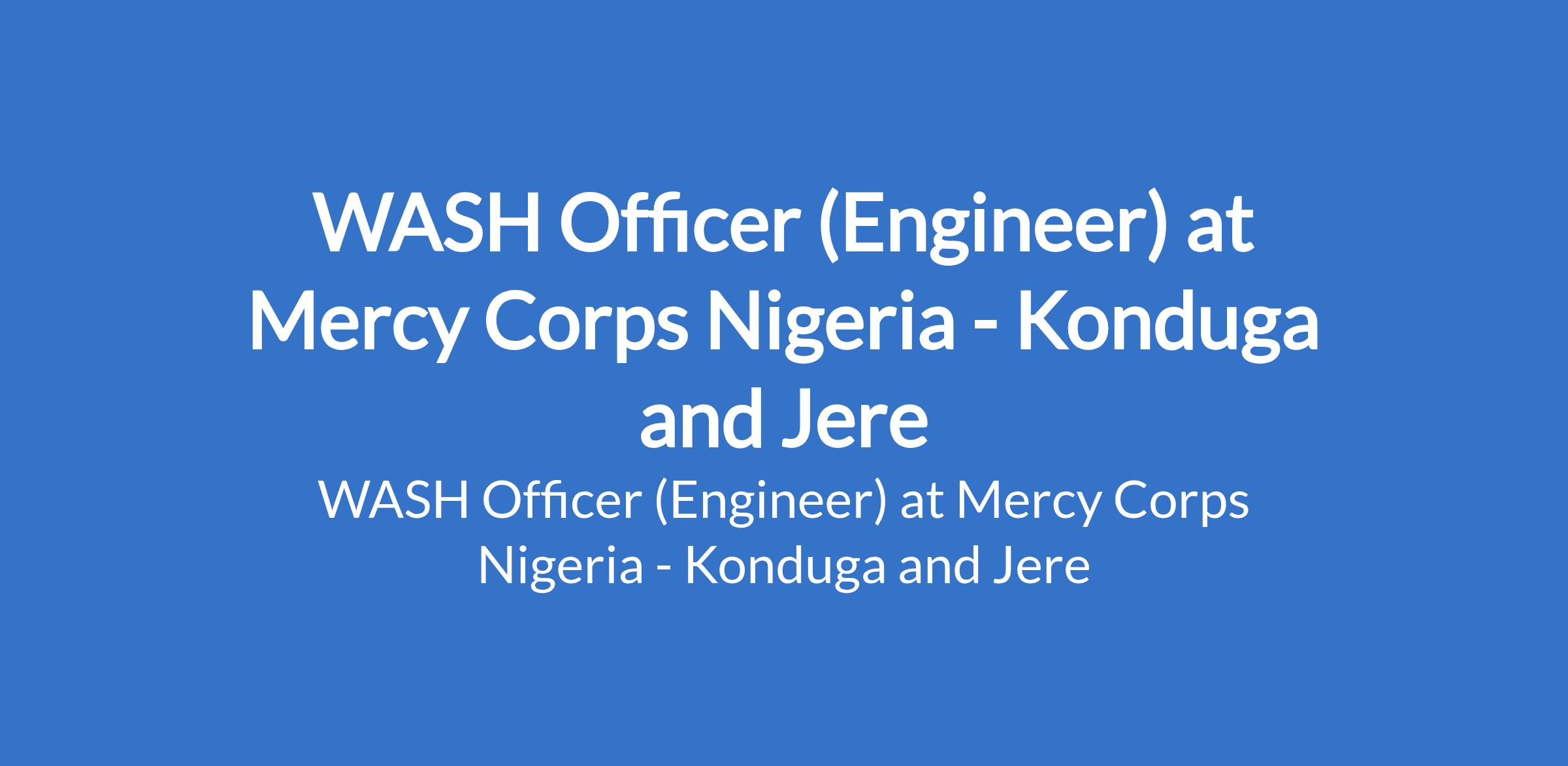 Mercy Corps Nigeria is recruiting to fill the position of: WASH Officer (Engineer). The position is located in Jere and Konduga - Borno State. Interested candidates should possess a University Degree in Social Science, Public Health, Environmental Health, Nursing, Engineering, or related field with experience in WASH emergency programming with strong focus on community mobilization.