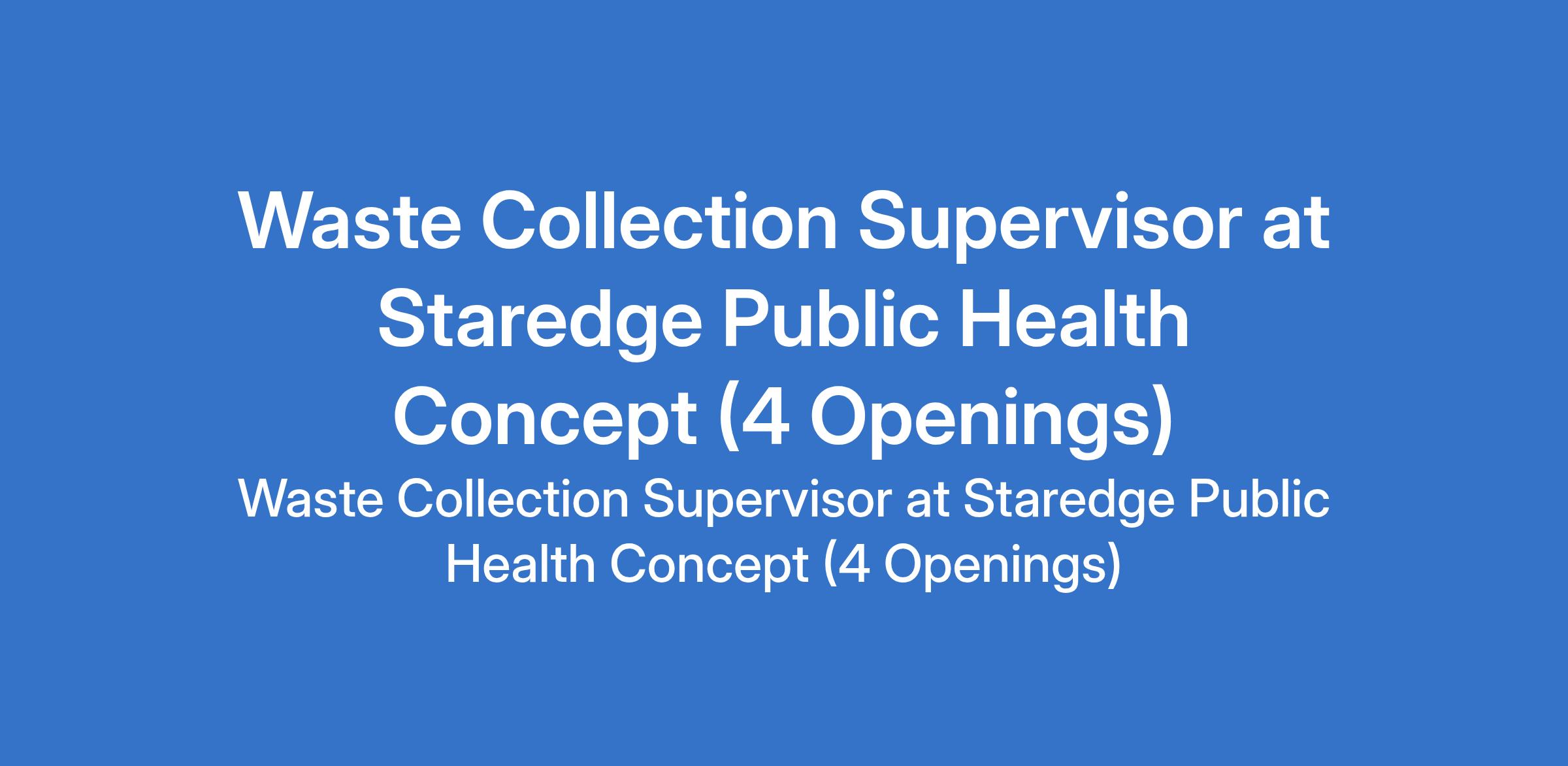 Staredge Public Health Concept is recruiting to fill the position of: Waste Collection Supervisor. The position is located in Bwari, Kubwa, Mpape, Dutse - Abuja (FCT). Salary: N100,000 - N160,000 monthly. Interested candidates should possess a graduate qualification and must reside within the location stated above or its environ and also own a smartphone.
