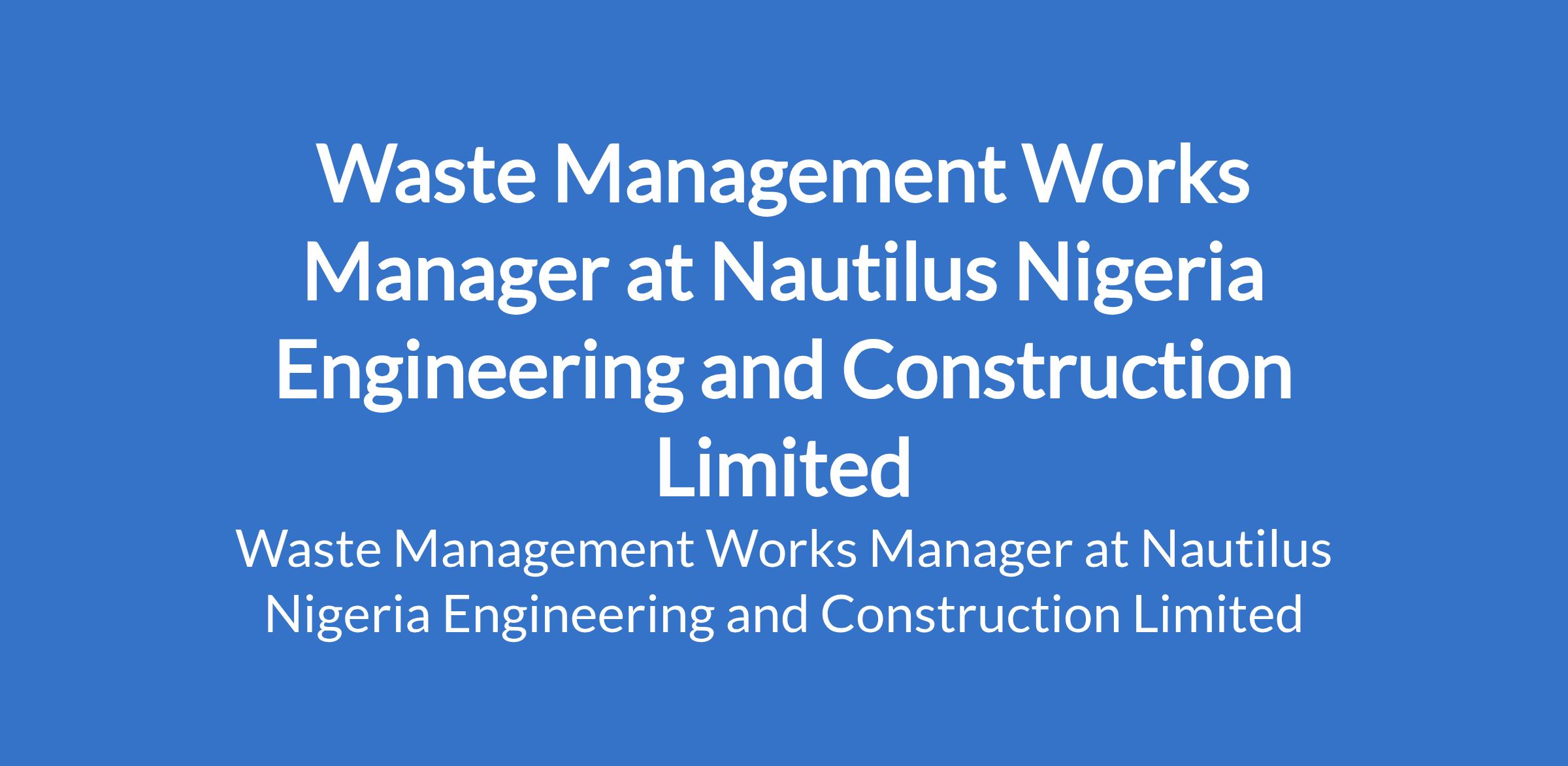 Nautilus Nigeria Engineering and Construction Limited (NNEC) is recruiting to fill the position of: Waste Management Work Manager. The position is located in Rivers State. Interested candidates should possess a Bachelors Degree in Environmental Engineering, Chemical Engineering, or a related field with a minimum of 10 years experience in waste management or oilfield operations.