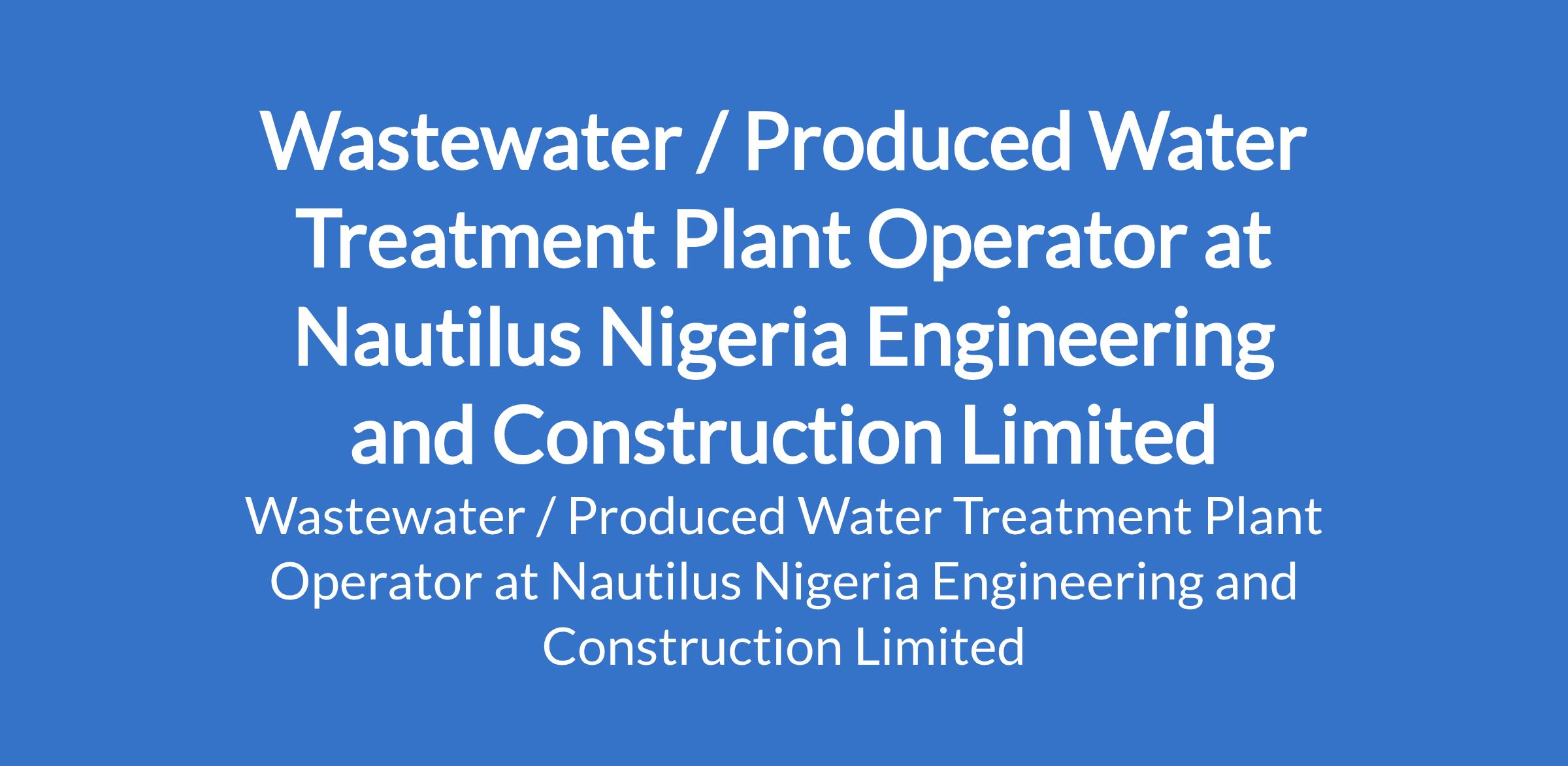 Nautilus Nigeria Engineering and Construction Limited (NNEC) is recruiting to fill the position of: Wastewater / Produced Water Treatment Plant Operator. The position is located in Rivers State. Interested candidates should possess a Bachelors Degree or HND in Environmental Science, Chemical Engineering, or related discipline with 7 years experience in water treatment operations.