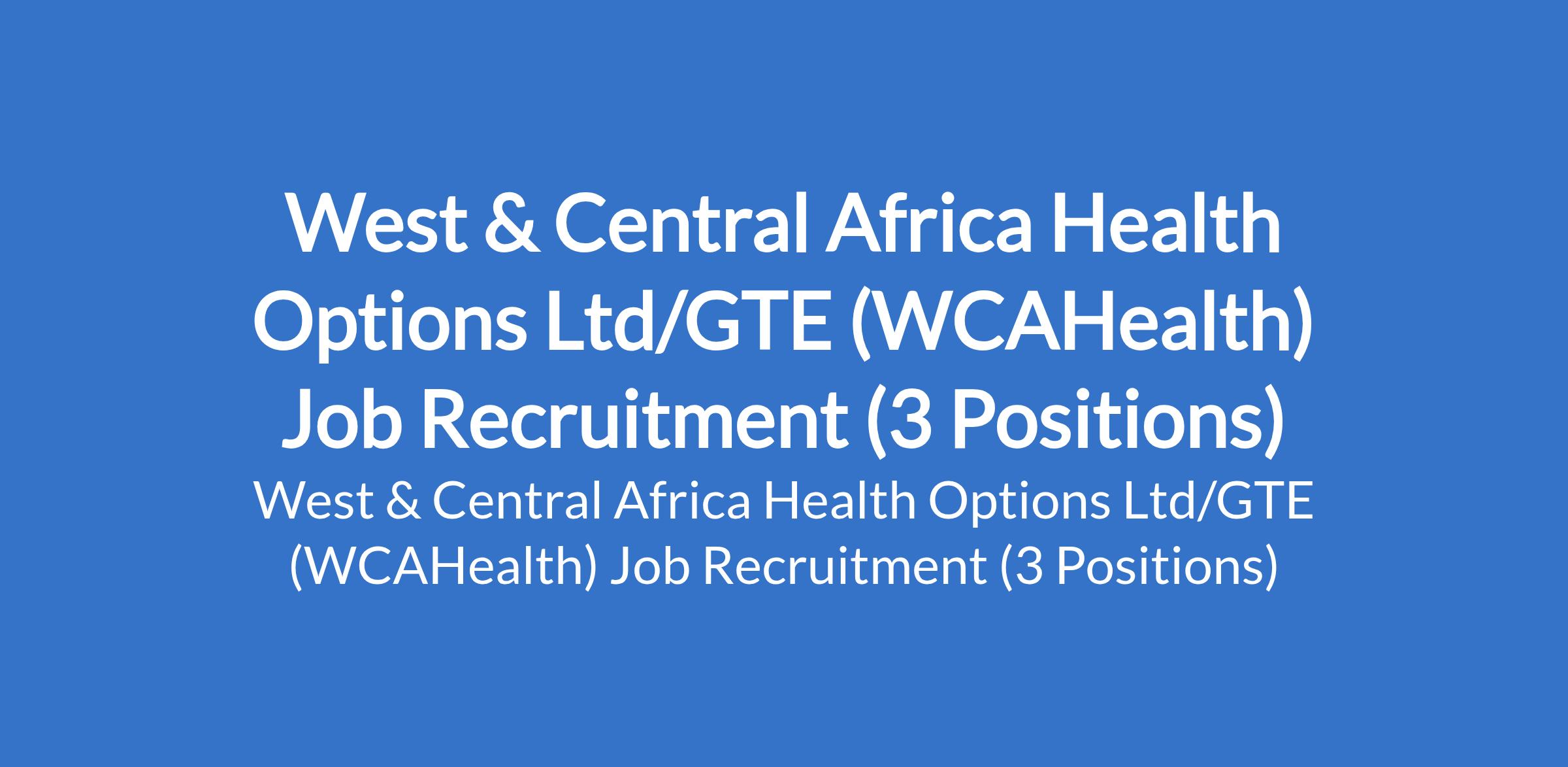 West & Central Africa Health Options Ltd/GTE (WCAHealth) is recruiting suitable candidates to fill the following positions in Gombe and Borno States: Community Engagement Officer, Finance Manager, and Technical Advisor, HCD, Adolescent, SRHR & PHC Integration.